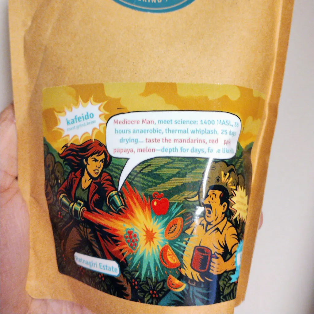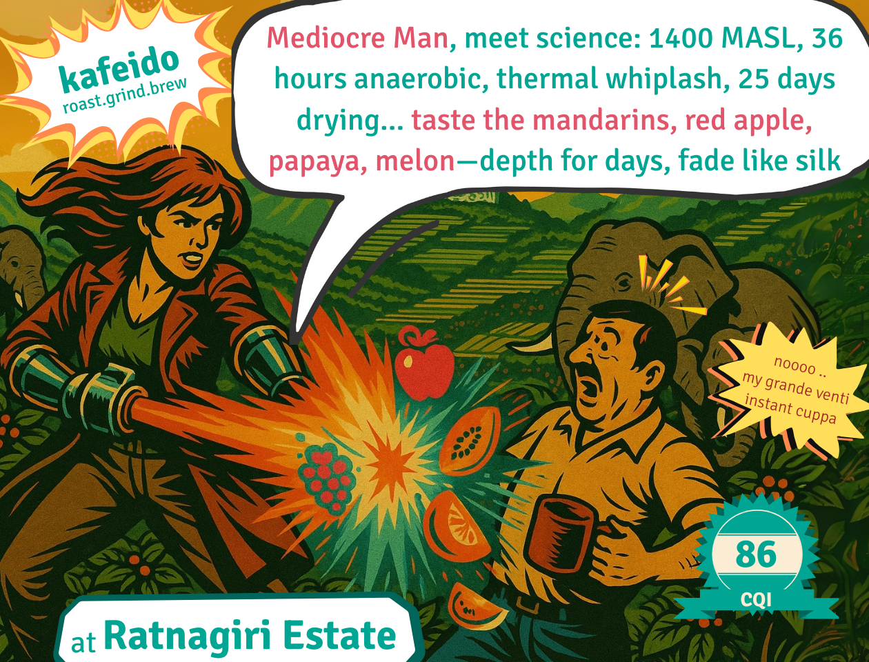 This naturally processed Catuai coffee, grown at 1400 MASL at Ratnagiri Estate, undergoes a unique scientific method: a 36-hour anaerobic fermentation using lab-isolated microbes in bio fermenters, followed by a thermal shock—rapid hot and cold water immersion that locks in volatile aromas and sugars. The cherries are then dried on raised beds for 25 days in a tightly controlled environment, ensuring clean, even fermentation without spoilage.